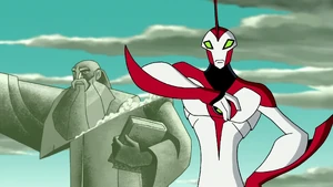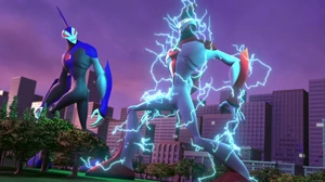 - ↑ In Ultimate Alien, Way Big's cosmic ray attack was executed by crossing his arms in an "L" shape, with his right forearm vertical and left forearm horizontal in front of it and the thumb edge of his hands facing his body. In Omniverse, this move is slightly revised, as Way Big now crosses his arms in an "X" shape.
